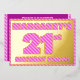 The front of this fun and bold twenty-first birthday party/celebration foil announcement card features a customizable name, a large number “21st”, the message “BIRTHDAY PARTY!”, and a border, all featuring a feminine light pink and dark pink stripes pattern. The back features personalized details about the event, such as the date, time, venue/place, and any other information that may be useful. Personalized invitations like these might be used to invite attendees to a birthday gathering being held to honor somebody’s 21st birthday. [~Z0000597]