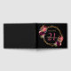A Guest Book for a 21st birthday party. A chic black background with a faux gold geometric frame. Decorated with dark purple and burgundy flowers, roses and boho style feathers. Templates for a name, age 21 and a date. Date of birth or the date of the party. The name is written with a hand lettered style script, pink colored letters, age in purple and the date with golden numbers. Text on the spine.