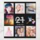 A bottle label for a 21st birthday party, celebrating her life with a collage of 8 of your photos. Templates for a name, age 21 and a date. Date of birth or the date of the party. White and gray colored letters. Elegant black background color.