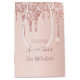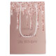 A gift bag for a girly and glamorous 21st birthday. A faux rose gold background with an elegant faux rose gold glitter drips, paint drip look. The text: The name is written in dark rose gold with a modern hand lettered style script. Tempate for a date and age 21.