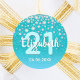 An elegant, glamorous and girly 21st birthday party sticker. Teal, blue green colored faux glitter with faux diamond sprinkle and a golden frame. Templates for a name, age 21 and a date. Date of birth or the date of the party/anniversary. White and teal colored letters. The name is written with a hand-lettered style script.