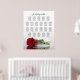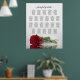 This elegant 22 table wedding seating chart features a beautiful photo of a single red rose reflecting in water with waves and ripples. The title reads "please find your table" in lacy script calligraphy. There is space for the couples' names and wedding date. This chart has table assignments for 220 guests 10 people per table.