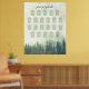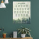 This elegant 22 table wedding seating chart features a rustic yet elegant design with a woodland scene of a foggy or misty hillside covered in green mountain pine trees. The title reads "please find your table" in lacy script calligraphy. There is space for the couples' names and wedding date. This chart has table assignments for 220 guests 10 people per table. Perfect for an outdoor or wilderness destination wedding.