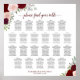 This 22 table wedding seating chart has seating assignments for 220 people with 10 seats per table. It features a rustic boho chic floral design with hand painted watercolor roses in shades of crimson red, burgundy, and blush pink, interspersed with sprigs of eucalyptus leaves and garden greenery. There is an elegant script calligraphy title reading "please find your table" with the names of the couple and wedding date at the bottom. Great way to add beauty, grace, style, and charm to your wedding reception while making it easy for your guests to find their tables.