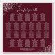 This beautiful wedding seating chart contains space for 220 names at 22 tables with the traditional 10 seats per table. The burgundy, maroon, or wine-red colored design is simple yet elegant with a script calligraphy title, and silver gray faux foil lace frills in the corners. Wonderful way to help your guests find their tables while adding class, elegance, and style to your wedding reception.