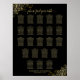 This wedding seating chart features a beautiful design with gold text on a black background and lacy gold frills in the corner. It is simple yet elegant with a calligraphy title reading "please find your table." Includes table assignments for 22 tables at 10 guests per table.