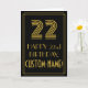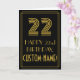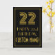 The front of this Roaring Twenties inspired birthday-themed greeting card design features a large Art Deco style inspired number "22", the message "HAPPY 22nd BIRTHDAY,", a personalized name, and a border pattern consisting of lines. The inside features a custom birthday greeting message, or could perhaps be cleared and left blank if a message is to be written by hand instead. A customizable birthday card like this might be a fun way to send a message in celebration of somebody’s twenty second birthday. [~Z0000394]