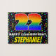 This colorful and vibrant birthday themed jigsaw puzzle design features a large number “22” having a multicolored rainbow spectrum inspired gradient pattern. It also features the message “HAPPY 22nd BIRTHDAY,”, and a custom recipient name. The background features an upbeat, multicolored star shapes pattern. A cheerful, editable birthday puzzle like this might be given in celebration of somebody’s twenty-second birthday. [~Z0000607]
