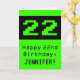 This geeky and nerdy birthday-themed greeting card design features a large green classic computer game style number "22" on the front. It also features the birthday greeting message "Happy 22nd Birthday,", and a personalized name. The inside features an editable birthday greeting message, or could perhaps be cleared and left blank if a message is to be written by hand instead. A fun and geeky birthday greeting card like this might be used to celebrate the twenty second birthday of an engineer, a computer system administrator, or somebody who appreciates vintage video games. [~Z0000430]