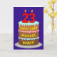This upbeat and cheerful birthday greeting card design features a depiction of a three-tier birthday cake having number-shaped candles on top showing the age “23“, along with the message “HAPPY 23RD BIRTHDAY,”, and a customizable recipient name. The inside has a custom birthday greeting message, or could perhaps be cleared and left blank if a message is to be written by hand instead. A fun, customizable birthday greeting card like this might be used to celebrate somebody’s twenty-third birthday. [~Z0000620]