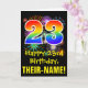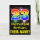 The front of this colorful, exciting, and fun birthday themed greeting card design features a large number "23" with a rainbow spectrum gradient inspired pattern, along with the message "Happy 23rd Birthday,", and a customizable recipient name. The front additionally has a colorful bursting celebratory fireworks inspired background pattern. The inside features an editable birthday greeting message, or could perhaps be cleared and left blank if a message is to be written by hand instead. A customizable birthday card like this might be a fun way to send a message celebrating somebody’s twenty third birthday. [~Z0000442]