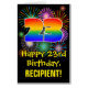 The front of this cheerful, fun, and colorful birthday greeting card design features a large number “23” with a rainbow spectrum gradient inspired pattern, along with the message “Happy 23rd Birthday,”, and a personalized recipient name. The front additionally features an exciting and colorful background pattern inspired by bursting celebratory fireworks. The inside features a customized birthday greeting message, or could perhaps be cleared and left blank if a message is to be written by hand instead. A customizable birthday card like this might be a fun way to celebrate somebody’s twenty third birthday. [~Z0000526]