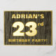 The front of this bold twenty-third birthday party/celebration foil invitation card features a custom name, a large number “23rd”, the message “BIRTHDAY PARTY!”, and a border, all in foil. There is a rustic, yet sophisticated, faux wood grain look inspired pattern for the background of the front. The back features personalized details about the event, such as the date, time, venue/location, and any other important information. Editable invitations like these might be used to invite guests to a birthday party/gathering being held in celebration of somebody’s 23rd birthday. [~Z0000598]