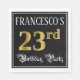 This fancy and elegant birthday-themed paper napkin design features a custom name and the message “23rd Birthday Party”. The large number “23rd” has an imitation/faux gold-inspired coloring pattern, the words “Birthday Party” are in opulent script-style text, and the background is colored black by default (although it can be customized). Ornate, luxurious paper napkins like this might be used at a birthday celebration being held in celebration of somebody’s twenty third birthday. [~Z0000565]