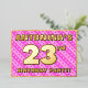 The front of this loving and fun twenty-third birthday celebration/party foil invitation card design features a custom name, a large number “23rd”, the message “BIRTHDAY PARTY!”, and a border. The background of the front has an upbeat dark pink and light pink striped pattern, with heart shapes. The back features personalized details about the event, such as the date, time, venue/location, and any other information that may be useful. Customized invitations like these might be a fun way to invite guests to a birthday party/gathering being held in celebration of somebody’s 23rd birthday. [~Z0000603]