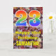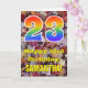 The front of this colorful, nature-inspired, and autumn-themed birthday greeting card design features a large number "23" with a rainbow spectrum gradient inspired pattern, along with the message "Happy 23rd Birthday,", and a customizable name. The background of the front of the card features a rustic fallen autumn leaves pattern. The inside features a personalized birthday greeting message, or could perhaps be cleared and left blank if a message is to be written by hand instead. A personalized birthday card like this might be a fun way to send birthday wishes to somebody who is celebrating their twenty third birthday. [~Z0000384]