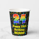 This cheerful and colorful music-themed birthday paper cup design features a large number “24” with a rainbow spectrum gradient inspired pattern, along with the message “Happy 24th Birthday,”, and a custom name. The background features an exciting and colorful pattern having music notes and symbols of various colors and sizes. Colorful, vibrant paper cups like this might be fun to use at a birthday celebration/party being held to honor somebody’s 24th birthday. [~Z0000541]