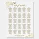 This beautiful wedding seating chart features a simple yet elegant design with gold text on a white background. The title is written in lacy script calligraphy and there are fancy golden faux foil curls and swirls in the corners. Has seating assignments for 250 guests at 25 tables with the traditional 10 seats per table. There is space for the names of the couple and wedding date below.