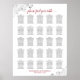 This beautiful wedding seating chart includes table assignments for 250 guests with 10 guests per table. The design is simple yet elegant featuring dark gray and red text on a white background with lacy silver faux foil floral filigree in the corners, and calligraphy script reading: please find your table. Excellent way to add some class to your reception while making it easy for your guests to find their seats.