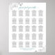 This beautiful wedding seating chart includes table assignments for 250 guests with 10 guests per table. The design is simple yet elegant featuring dark gray and teal or turquoise text on a white background with lacy silver faux foil floral filigree in the corners, and calligraphy script reading: please find your table. Excellent way to add some class to your reception while making it easy for your guests to find their seats.