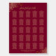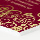 This beautiful wedding seating chart features a simple yet elegant design with gold text on a burgundy, maroon, or wine red colored background. The title is written in lacy script calligraphy and there are golden faux foil lace curls and swirls in the corners. Has seating assignments for 250 guests at 25 tables with the traditional 10 seats per table. There is space for the names of the couple and wedding date below.