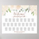 This beautiful watercolor floral wedding seating chart has room for 250 guests at 25 tables with 10 seats per table. The rustic boho chic design features hand painted roses, flowers, and blossoms in neutral pastel shades of champagne blush or pale peach, along with sprigs of eucalyptus leaves and garden greenery. The elegant script calligraphy title reads: Welcome! Please find your table, with the couple's names and wedding date at the bottom. Wonderful way to welcome guests to your reception while making it easy for them to find their seats.