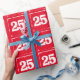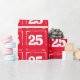 Holiday wrapping paper with tiled white text that reads simply 25 to depict the date, December 25, Christmas! You can customize the red background to be any color you want.