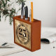 Gold foil style 25th-anniversary desk organizer with a business logo and year. Double-sided with the same design. Ideal for the boss and employees. Commemorative design with a laurel branch and stars. The logo can be changed for text by clicking the button to edit the design.