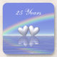 Pretty drink coasters with my artwork of silver hearts floating on the water under a rainbow with text that says "25 Years".