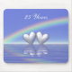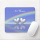 Mousepad with my design of two silver hearts floating on the water under a rainbow. Customizable text says "25 Years".