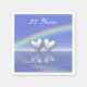 Napkins with my original digital design of two silver hearts floating on the water under a rainbow. Text says "25 Years".