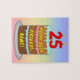 This upbeat and colorful birthday-themed jigsaw puzzle design features a cartoon-style depiction of a three-tier birthday cake having numeral-shaped candles on top showing the number “25“, along with the message “HAPPY 25TH BIRTHDAY,”, and a personalized recipient name. The background features a multi-color pastel rainbow spectrum inspired gradient pattern. A cheerful, editable birthday puzzle like this might be a fun way to send a birthday greeting message to somebody who is celebrating their twenty-fifth birthday. [~Z0000621]