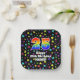 This fun and joyful birthday-themed paper plate design features a large number “25” with a rainbow spectrum gradient inspired pattern, along with the message “Happy 25th Birthday,”, and a custom name. The background features a colorful pattern having many star shapes with different sizes and colors. Paper plates like this might be used when celebrating somebody’s twenty fifth birthday. [~Z0000582]
