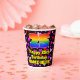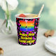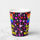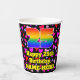 This cheerful and colorful birthday paper cup design features a large number “25” with a rainbow spectrum gradient inspired pattern, along with the message “Happy 25th Birthday,”, and a customizable name. The background features a pattern of heart shapes with colors like red, purple, and pink. Upbeat, friendly paper cups like this might be fun to use at a birthday party being held in celebration of somebody’s twenty fifth birthday. [~Z0000548]
