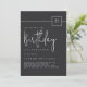 The modern minimalist layout pairs a deep matte black background with refined ivory-beige typography—featuring a bold sans-serif for the event details and a graceful handwritten script for the word “Birthday.” A sleek square badge highlights the milestone age, adding a sophisticated touch for any adult birthday celebration.