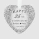 Silvery metallic background with silver glitter announces the celebration of a happy 25th Silver anniversary. A gift of silver is traditional for this wedding anniversary milestone. The colors of white, black lettering, and silver are romantic for commemorative heart ornament.