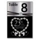 25th Silver Wedding Anniversary Party table cards. DIRECTIONS TO ADD NAMES/NUMBERS TO CARDS - Step 1 add name and number on first card then add to your cart. Step 2 - click on the picture to the left and it will return you back to the card so you can add the second number then add it to your cart - Repeat process until all names and/or numbers have been added. Step 3 - Checkout or continue shopping. ⭐This Product is 100% Customizable. Graphics and text can be deleted, moved, resized, changed around, rotated, etc... ⭐99% of my designs in my store are done in layers. This makes it easy for you to resize and move the graphics and text around so that it will fit each product perfectly. ⭐ (Please be sure to resize or move graphics if needed before ordering) You can also "TRANSFER DESIGN" on other Zazzle products and adjust the design to fit most of Zazzle items. (button is down on the right side of the page) Some of the text graphics have ready to fill in the box(es) or you can Click on the "CUSTOMIZE" button to add, move, delete, resize, background color or change any of the font or graphics. The design is made with high resolution vector and/or digital graphics for a professional print. ⭐NOTE: (THIS IS A PRINT. All zazzle product designs are "prints" unless otherwise stated under "About This Product" area) The design will be printed EXACTLY like you see it on the screen and on the product...so please make sure when you do your changes on the resizing of any of the graphics or text that it fits in the areas correctly and that your spelling and wording is how you like it to be in size, color and font. If you have any questions about the "DESIGN ONLY" or need help please contact me at my direct email - siggyscott@comcast.net or visit my store link: http://www.zazzle.com/store/designsbydonnasiggy (Copy and Paste) I'll be happy to help. ⭐ ALL OTHER QUESTIONS (such as the shipping, a refund, the printing is incorrect, or the product itself, etc...) PLEASE CONTACT ZAZZLE OR THE MAKER ⭐DIRECTLY⭐. Thank you for the support and stopping by my store - DesignsbyDonnaSiggy. © Donna Siegrist⭐⭐⭐ ZAZZLE promises 100% satisfaction.