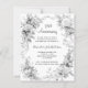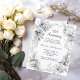A white background. Decorated with florals and a faux silver ribbon. Personalize and add a name and details.