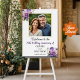 This Wedding Anniversary Welcome sign has an elegant script calligraphy, a gold frame with 1 special photo and purple roses. You can personalize this sign with your Wedding Anniversary details.