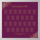 This beautiful wedding seating chart features gold text on a magenta or cassis purple background with seating assignments for 260 guests - 26 tables at 10 seats per table. It features a simple yet stylish and elegant design with ornate decorative faux foil gold filigree in the corners. The title is written in fancy script calligraphy and reads: Please find your table.