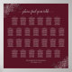 This beautiful wedding seating chart features pale gray text on a burgundy or maroon background with seating assignments for 260 guests - 26 tables at 10 seats per table. It features a simple yet stylish and elegant design with ornate decorative faux foil silver filigree in the corners. The title is written in fancy script calligraphy and reads: Please find your table.