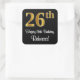 This sophisticated, elegant, and luxurious birthday square sticker design features a large ordinal number “26th” having an imitation/faux gold-like look, plus the birthday greeting message “Happy 26th Birthday,” and an editable name in a script-style font. It also has a black-colored background. Stylish stickers like this could be used when wrapping a birthday present or gift being given to somebody who is celebrating their 26th birthday, or perhaps might be given out to the attendees at a birthday party. [~Z0000517]