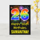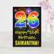 The front of this exciting, colorful, and fun birthday-themed greeting card design features a large number "26" having a rainbow spectrum gradient inspired pattern. It also features the message "Happy 26th Birthday,", and an editable recipient name. The front additionally has a colorful background pattern inspired by the look of bursting celebratory fireworks. The inside features a custom birthday greeting message, or could perhaps be cleared and left blank if a message is to be written by hand instead. A personalized birthday card like this might be a fun way to send a message in celebration of somebody’s twenty sixth birthday. [~Z0000442]