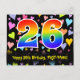 The front of this colorful, loving, and exciting birthday postcard design features a large number "26" with a rainbow spectrum gradient inspired pattern, along with the message "Happy 26th Birthday,", and an editable recipient name. The front additionally has a vibrant and colorful background featuring a pattern of loving heart shapes. The back features a personalized birthday greeting message, or could perhaps be cleared and left blank if a message is to be written by hand instead. A personalized birthday postcard like this might be a fun way to celebrate somebody’s twenty sixth birthday. Postcards like this might also be used to invite guests to a birthday party or celebration being held for somebody who is turning 26 years old. [~Z0000448]