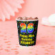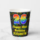 This fun and joyful music themed birthday paper cup design features a large number “26” with a rainbow spectrum gradient inspired pattern, along with the message “Happy 26th Birthday,”, and an editable name. The background features a colorful pattern having music notes and symbols of various colors and sizes. Vibrant, colorful paper cups like this might be fun to have at a birthday celebration/party being held to honor somebody’s 26th birthday. [~Z0000541]
