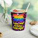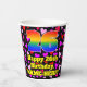This fun and joyful birthday themed paper cup design features a large number “26” with a rainbow spectrum gradient inspired pattern, along with the message “Happy 26th Birthday,”, and a customizable name. The background features a pattern of pink, purple, and red heart shapes of various sizes. Fun, loving paper cups like this might be fun to have at a birthday celebration being held in celebration of somebody’s 26th birthday. [~Z0000548]