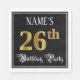This ornate and elegant birthday-themed paper napkin design features a personalized name and the message “26th Birthday Party”. The large number “26th” has a faux/imitation gold-inspired coloring pattern, and the words “Birthday Party” are in fancy script-style text. The background is colored black by default (although it can be customized). Fancy, opulent paper napkins like this might be useful to have at a birthday party/celebration being held to celebrate somebody’s 26th birthday. [~Z0000565]