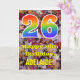 The front of this colorful, rustic, and nature-inspired birthday greeting card design features a large number "26" with a rainbow spectrum gradient inspired pattern, along with the message "Happy 26th Birthday,", and a customizable name. The front features a background depicting rustic fallen autumn leaves. The inside features a personalized birthday greeting message, or could perhaps be cleared and left blank if a message is to be written by hand instead. A customizable birthday card like this might be a fun way to acknowledge somebody’s twenty sixth birthday. [~Z0000384]