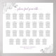 This beautiful wedding seating chart has seating assignments for 27 tables at 10 seats per table or 270 guests. It features a simple yet elegant design with dark gray and light purple or lavender text on a white background and lacy decorative faux foil silver filigree in the corners. The title is written in fancy script calligraphy and reads: Please find your table. Stylish and sophisticated!