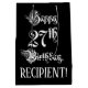 This fancy and opulent birthday gift bag design features the message “Happy 27th Birthday,” in ornate script style text, on a black colored background. It also features a customizable recipient name. A gift-bag like this might be used when wrapping gifts being given to somebody in celebration of their 27th birthday. [~Z0000557]